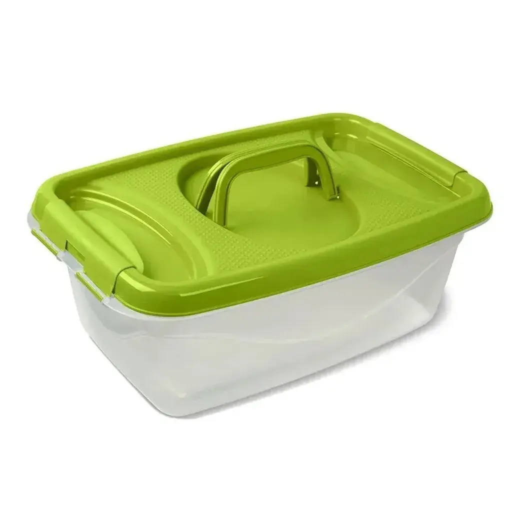 Объём 16 литров оптимален для крупных продуктовых запасов. Прямоугольная форма обеспечивает компактное хранение в шкафах и холодильнике. Текстурированная поверхность крышки предотвращает скольжение при переноске. Габаритные размеры: 34 × 24 × 18 см.
