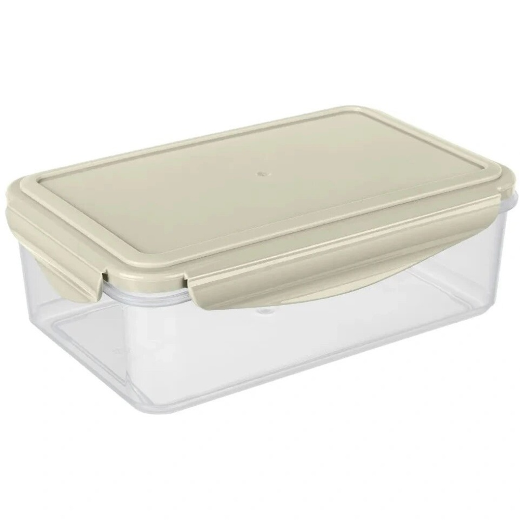 Контейнер имеет прямоугольную форму со светло-серой герметичной крышкой и прозрачными стенками. Объём составляет 1,1 литра. Крышка оснащена удобными защёлками с двух сторон для плотного закрытия. Плоское дно обеспечивает устойчивость на любой поверхности.