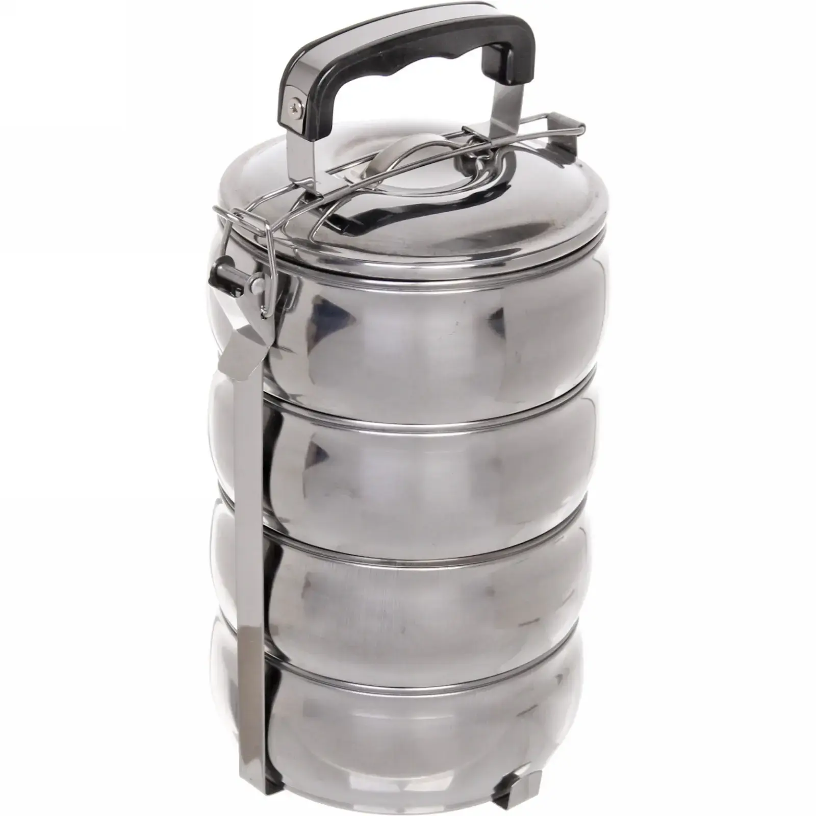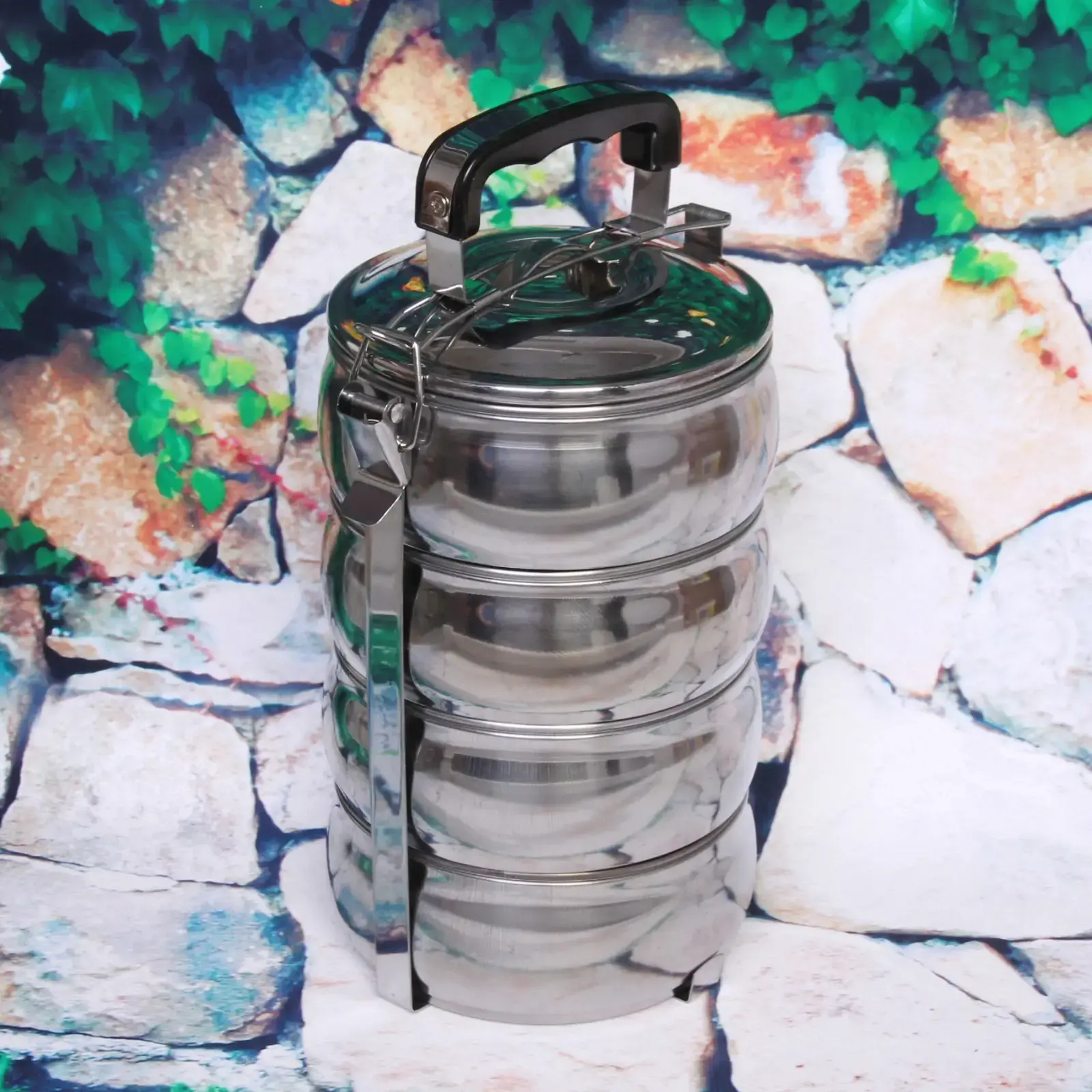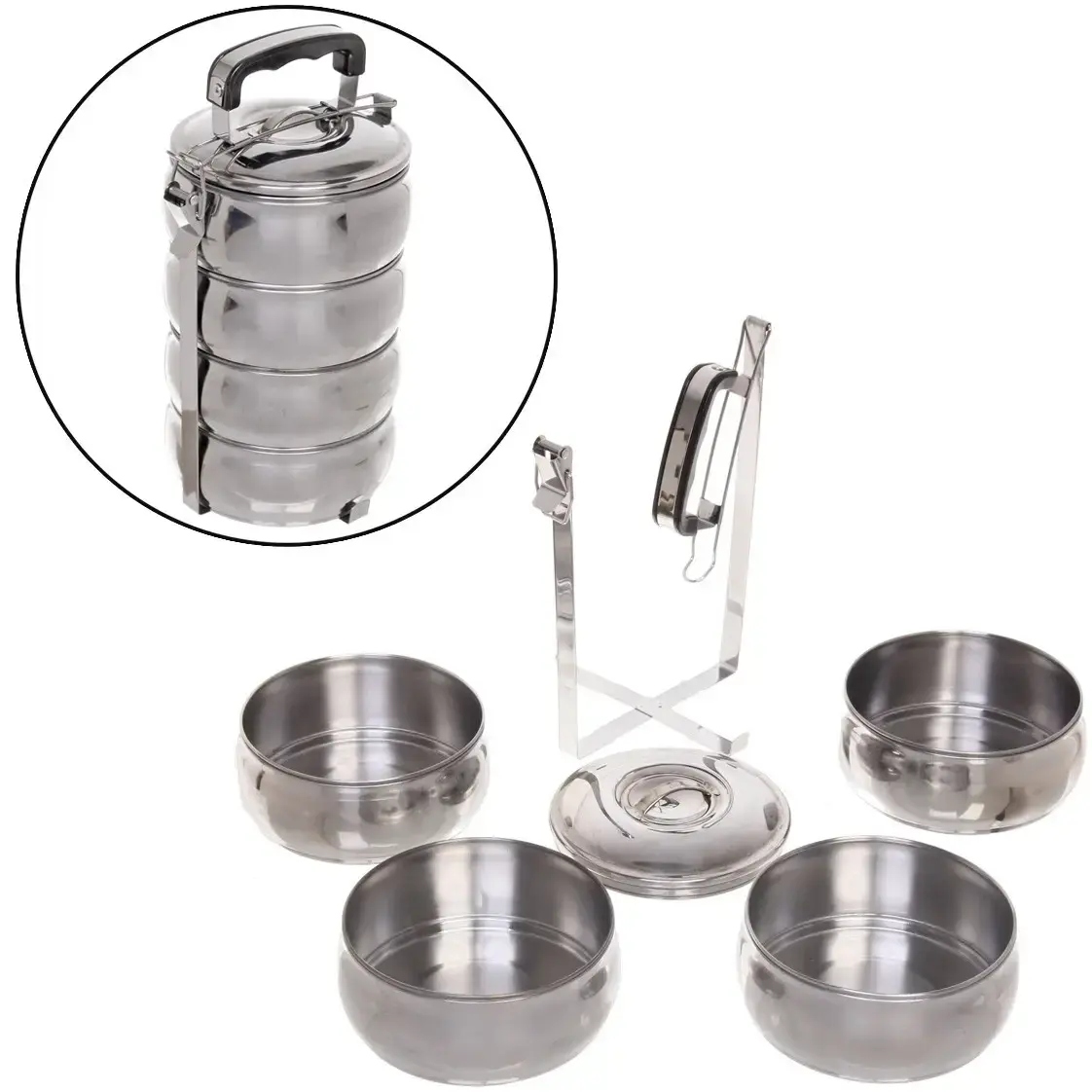 Контейнер состоит из четырех отдельных круглых ярусов, что позволяет удобно разделять различные блюда. Он оснащен черной пластиковой ручкой для комфортного переноса и металлическим зажимом, который надежно фиксирует крышку. Этот контейнер подходит для использования как на пикниках, так и в повседневной жизни, позволяя вам всегда иметь под рукой свежую еду.
