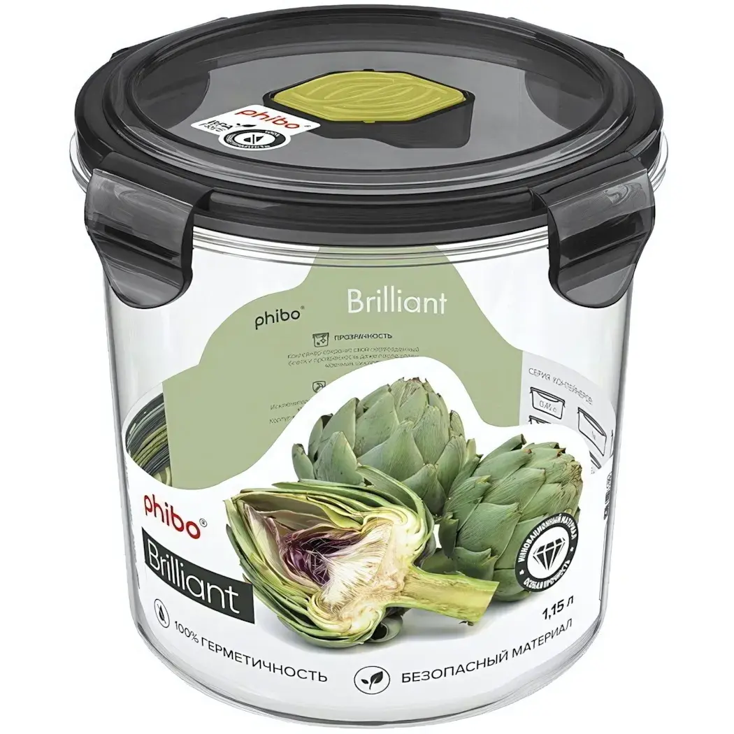 Контейнер имеет округлую форму и вмещает 1,15 литра, что делает его оптимальным для порции. Его черная крышка с боковыми защелками обеспечивает плотное закрытие, а прозрачные стенки позволяют видеть содержимое. Контейнер легко чистится и не мутнеет со временем, что делает его идеальным выбором для ежедневного использования.