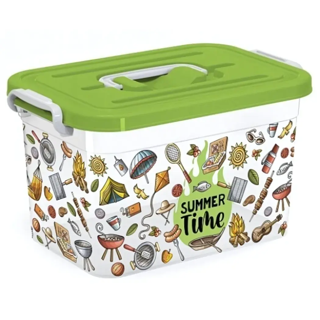 Контейнер имеет прямоугольную форму с ручками по бокам для удобного переноски. Размеры контейнера оптимальны для хранения различных летних принадлежностей. Яркая зеленая крышка с углублением для облегчения открывания добавляет функциональности и удобства в использовании. Этот контейнер станет незаменимым аксессуаром для вашего летнего отдыха!