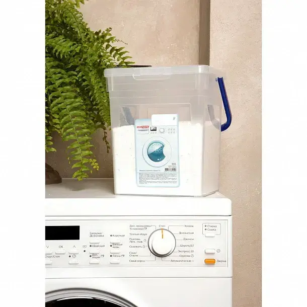 Контейнер предназначен для хранения стирального порошка и других сыпучих веществ. Он оснащен надежной крышкой с защелкой, что предотвращает попадание влаги и сохраняет порошок свежим. Прозрачные стенки позволяют легко контролировать количество порошка, оставшегося в контейнере, а удобная ручка обеспечивает комфортную переноску.