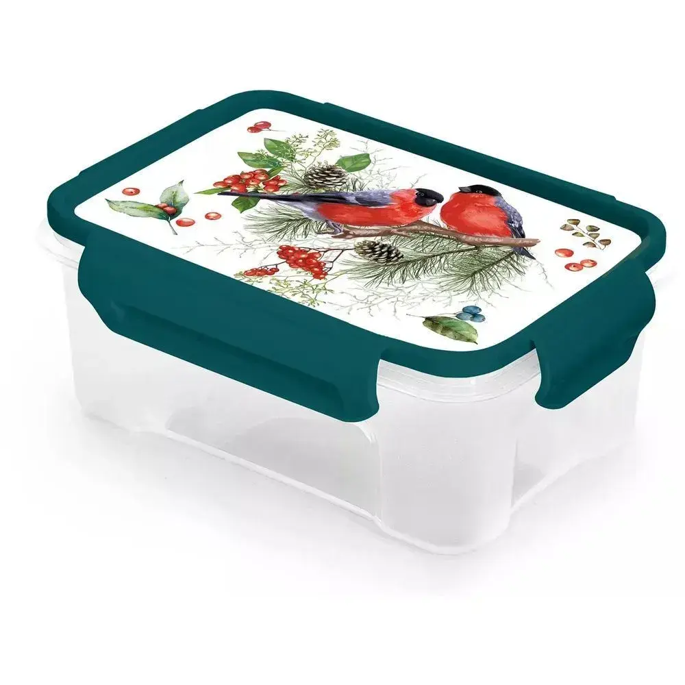 Контейнер для СВЧ «Снегири» с декором, 0,75л, прозрачный пластик, зеленая крышка