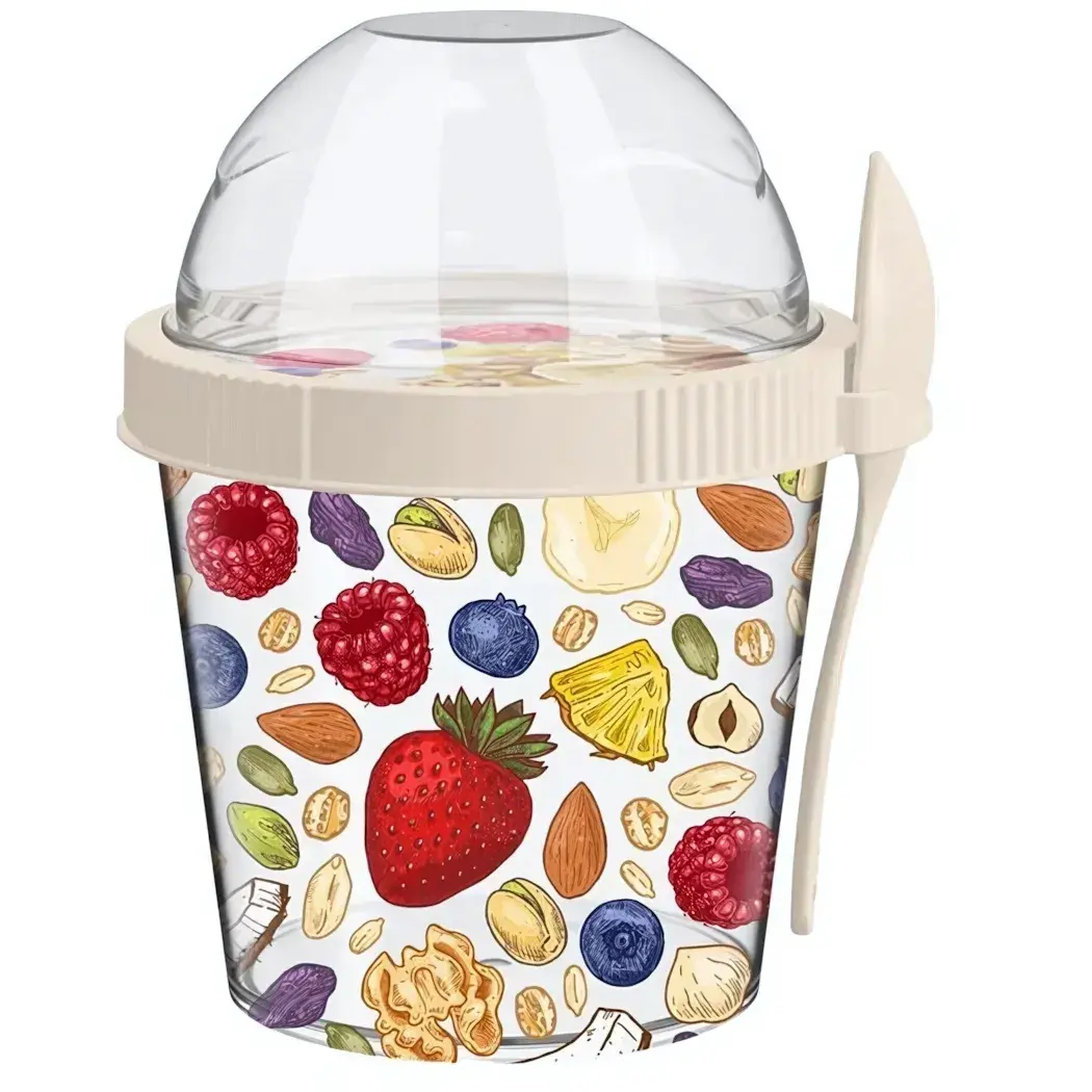 Контейнер для завтрака 450мл с ложкой, декор 'фрукты/орехи', светло-бежевый