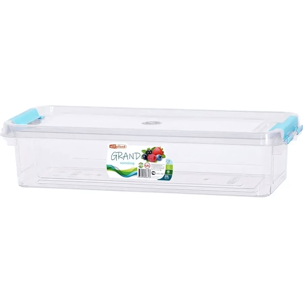 Пластиковый контейнер «Grand» от бренда Эльфпласт сочетает практичность и надежность. Герметичная крышка с голубыми защёлками сохраняет свежесть продуктов и защищает от протекания — идеальное решение для домашнего использования и пикников.