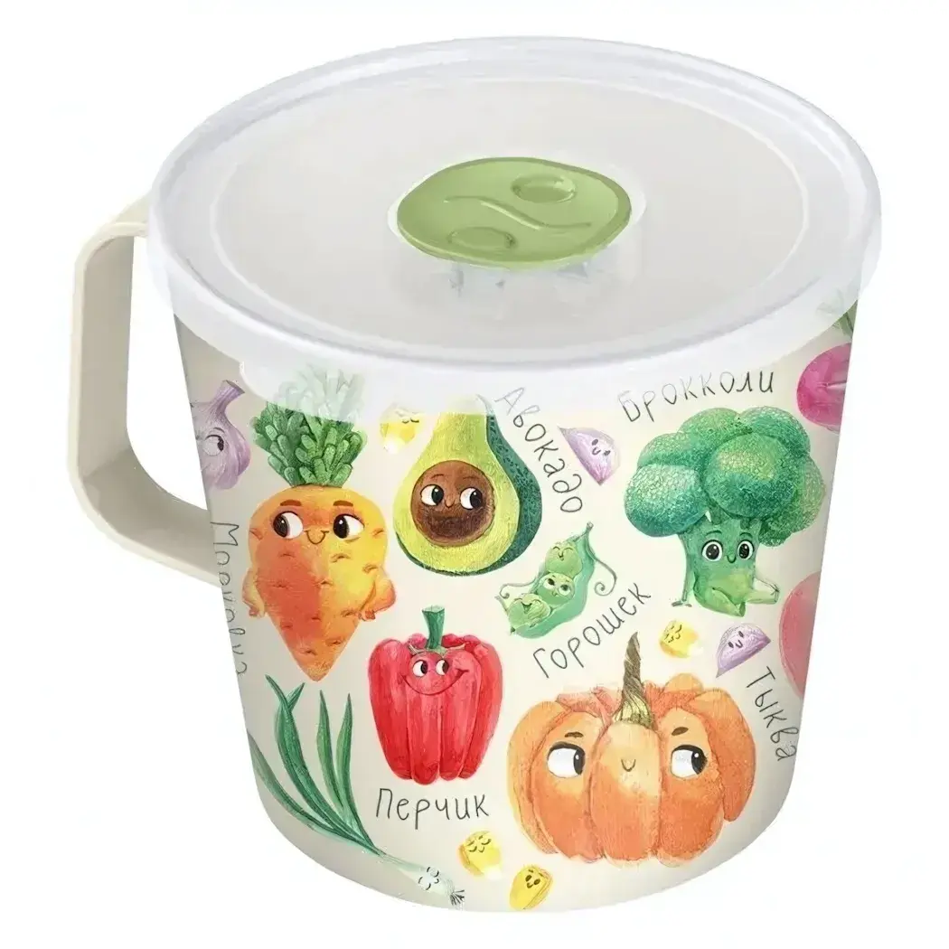 Объём 750 мл оптимален для порционных блюд и напитков. Универсальная форма позволяет использовать как контейнер для хранения и кружку для питья. Яркий декор с персонализированными овощами делает посуду узнаваемой среди других аналогичных изделий.