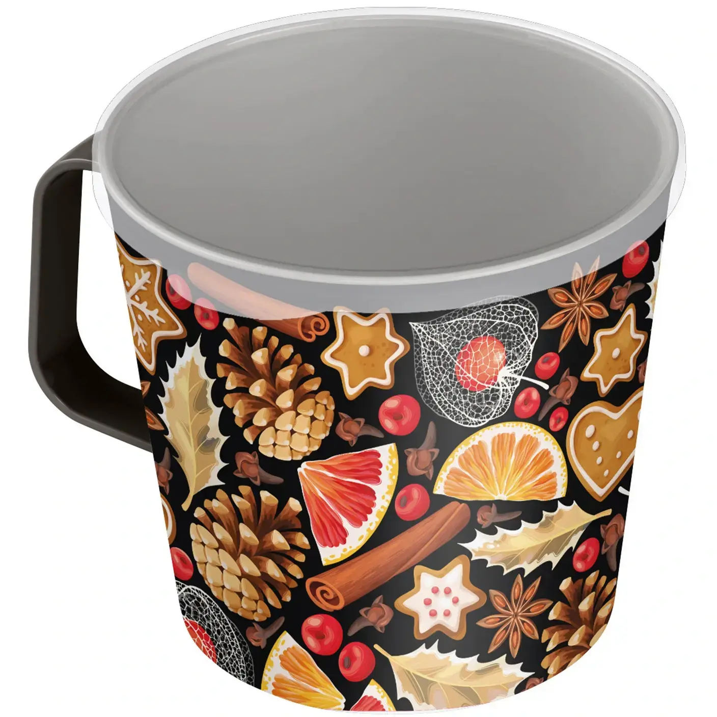 Контейнер имеет округлую форму и выполнен в черном цвете с ярким новогодним узором, который включает шишки, дольки апельсина и пряники. Он достаточно вместителен, чтобы хранить разнообразные блюда, и легко чистится. Размеры контейнера позволяют удобно хранить его в холодильнике или сумке. Выбирая контейнер-кружку «IZI-GO», вы получаете не только практичное решение для хранения пищи, но и стильный аксессуар для вашего стола.