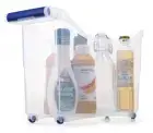Контейнер оснащен колесами, что обеспечивает легкость перемещения, даже когда он заполнен. Синие ручки на боках контейнера делают его удобным для захвата и транспортировки. Он идеально подходит для хранения бутылок с жидкостями, моющих средств и других предметов, которые требуют аккуратного хранения.