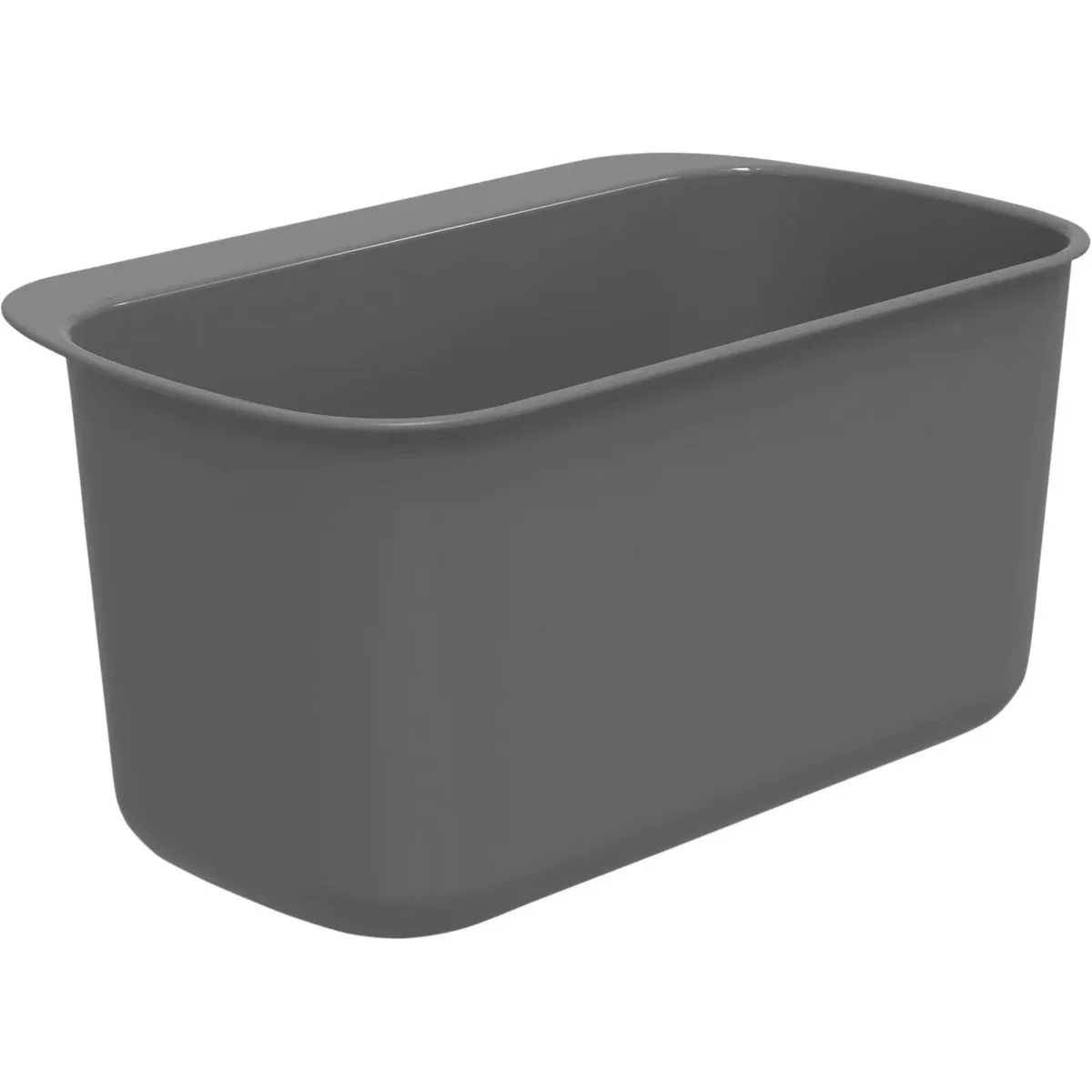 Контейнер имеет вытянутую прямоугольную форму с закруглёнными углами и устойчивым дном. Верхний обод обеспечивает дополнительную жёсткость конструкции, а выступающий плоский бортик предназначен для удобного подвешивания. Лаконичный дизайн без лишних элементов делает изделие универсальным для дома, офиса или подсобного помещения.