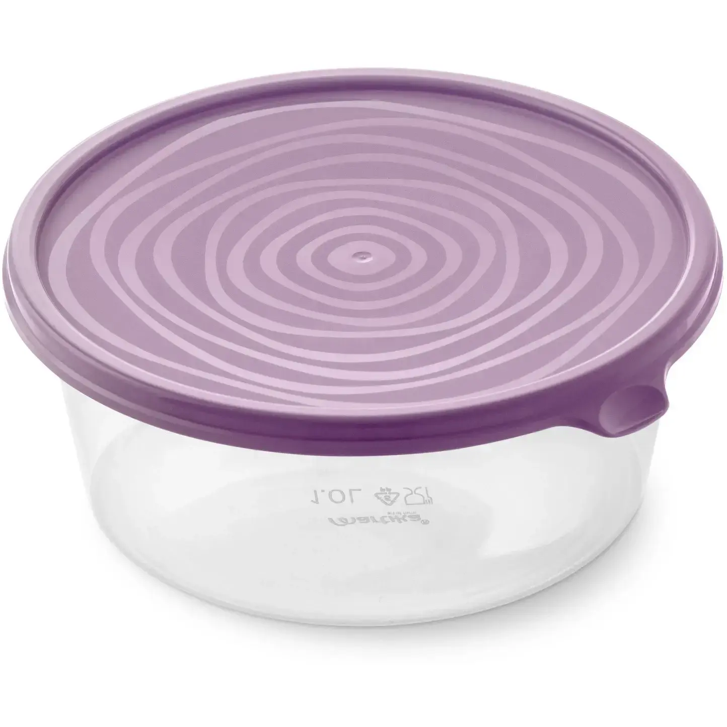 Объем контейнера составляет 1 литр, что идеально подходит для хранения небольших порций продуктов. Крышка контейнера выполнена в фиолетовом цвете с волнистым узором, что добавляет эстетическую привлекательность. Контейнер имеет стандартный размер, что делает его универсальным для использования в любых условиях.