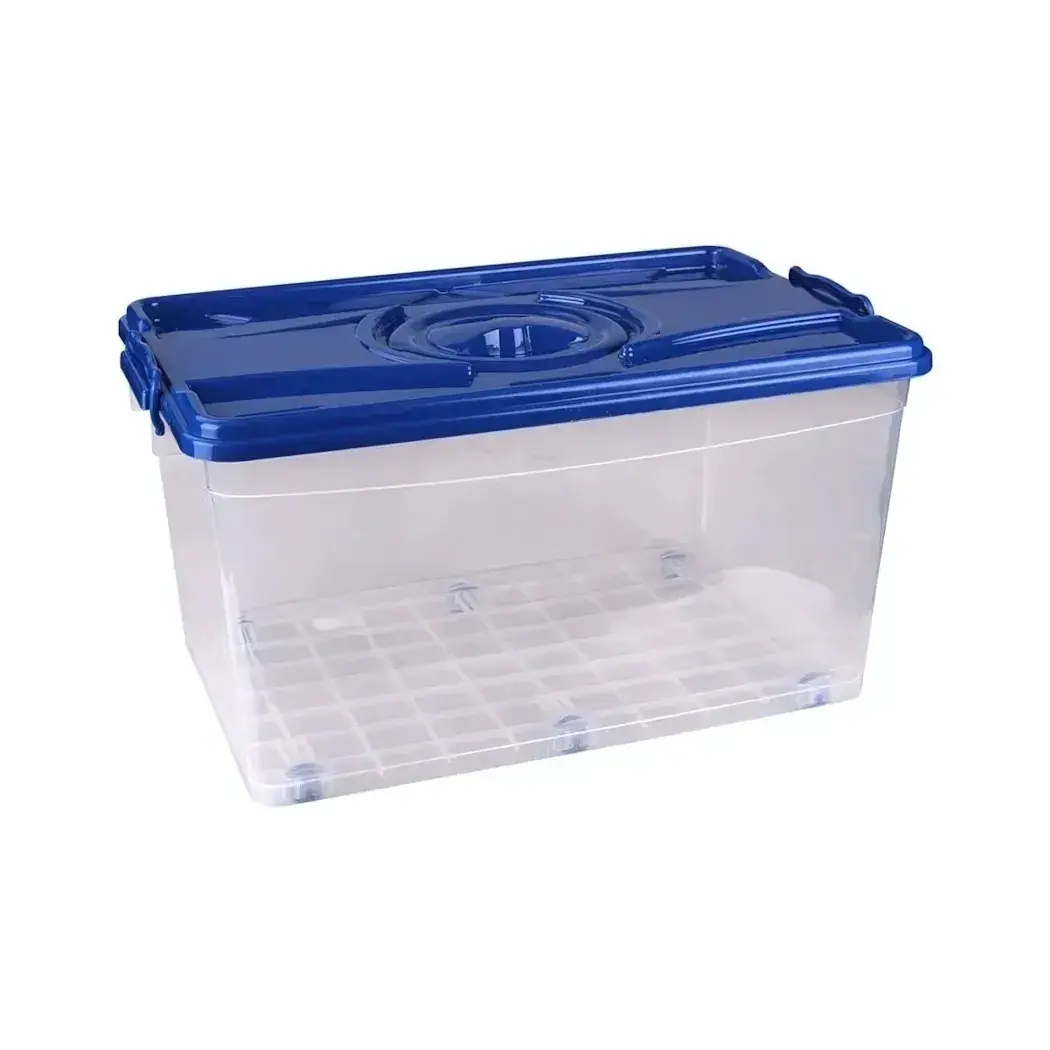 Прямоугольный контейнер с герметичной синей крышкой — идеальное решение для систематизации вещей в доме, гараже или на даче. Прозрачные стенки позволяют быстро найти нужные предметы, а прочный пластик гарантирует защиту от влаги и пыли.