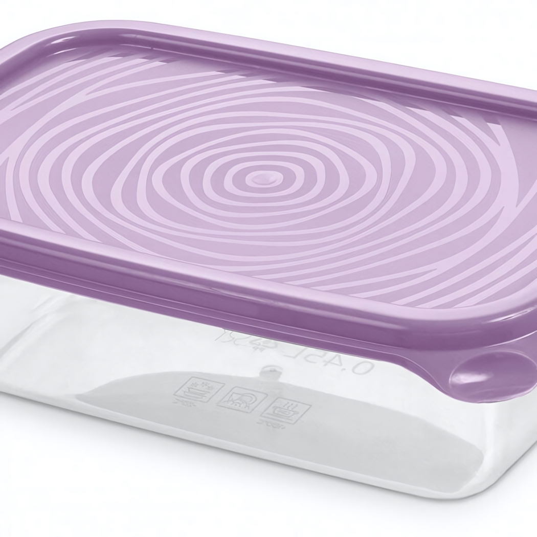 Контейнер имеет прозрачные стенки, что позволяет видеть содержимое, и крышку светло-фиолетового цвета с узором, что добавляет эстетики. Размер контейнера составляет 0,45 литра, что делает его идеальным для хранения небольших порций. Удобные ручки на крышке облегчают открытие, а гладкие внутренние стенки позволяют легко мыть контейнер после использования.