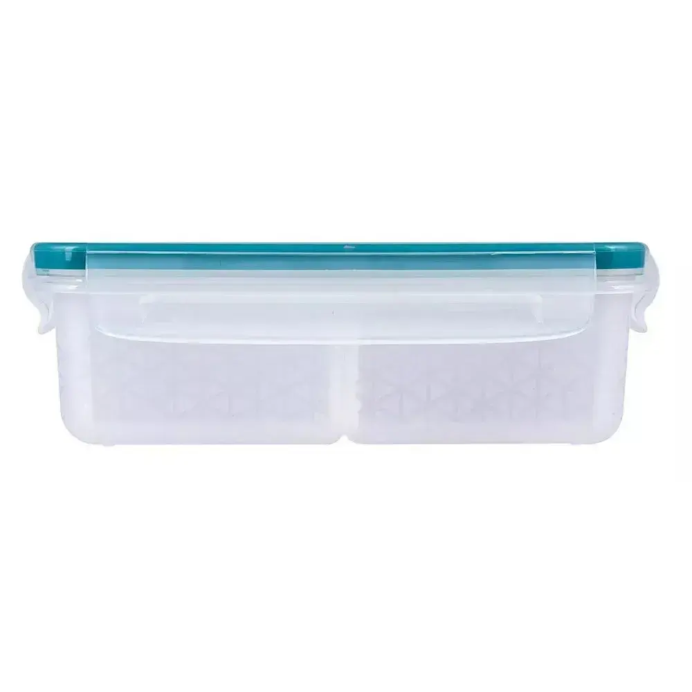 Объем 1 литр, корпус прозрачный, крышка с голубым периметром, внутренние разделители — всё для удобства и функциональности.
