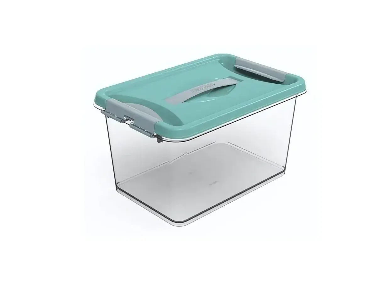 Бирюзовый цвет крышки гармонично впишется в современный интерьер, а прозрачный корпус обеспечивает быстрый визуальный доступ к содержимому. Габариты 23×35×19,1 см оптимальны для хранения средних объемов без потери мобильности контейнера.