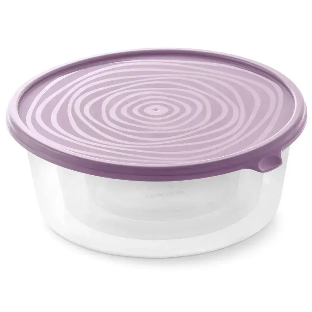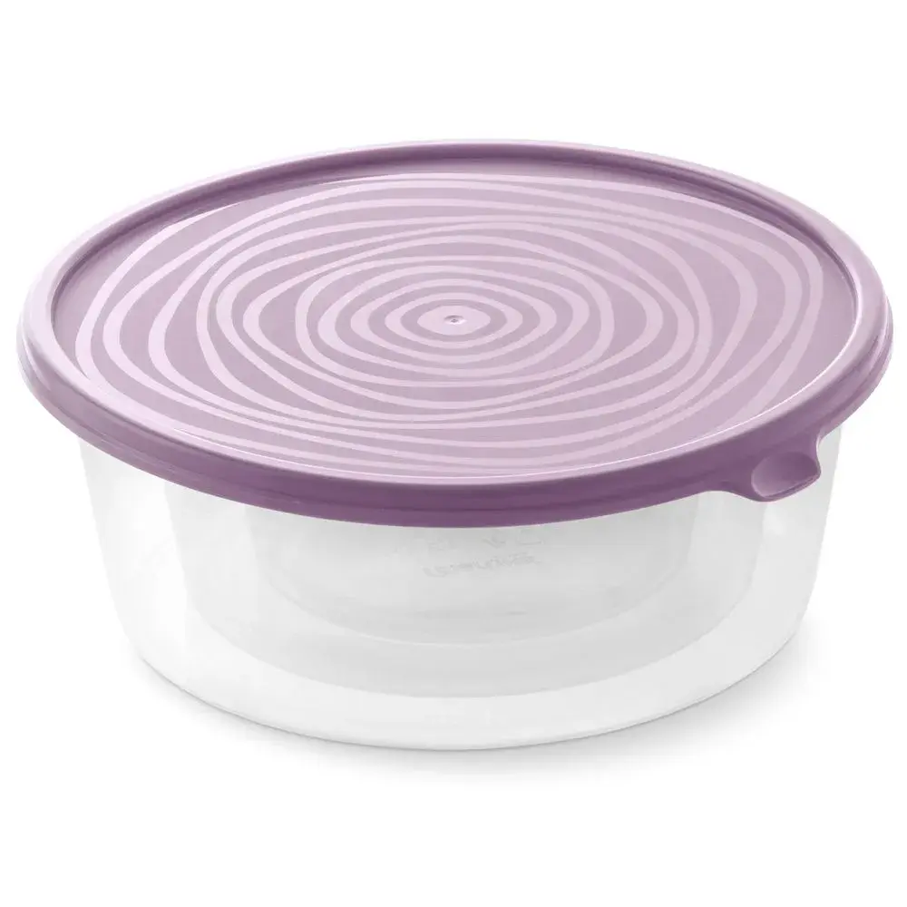 Этот круглый контейнер из пластика — идеальное решение для хранения продуктов дома. Прозрачные стенки позволяют мгновенно оценить содержимое, а крышка с удобной ручкой облегчает открытие и защищает от запахов и влаги. Светло-фиолетовая крышка с уникальным концентрическим узором смотрится стильно и радует глаз на любой кухне.