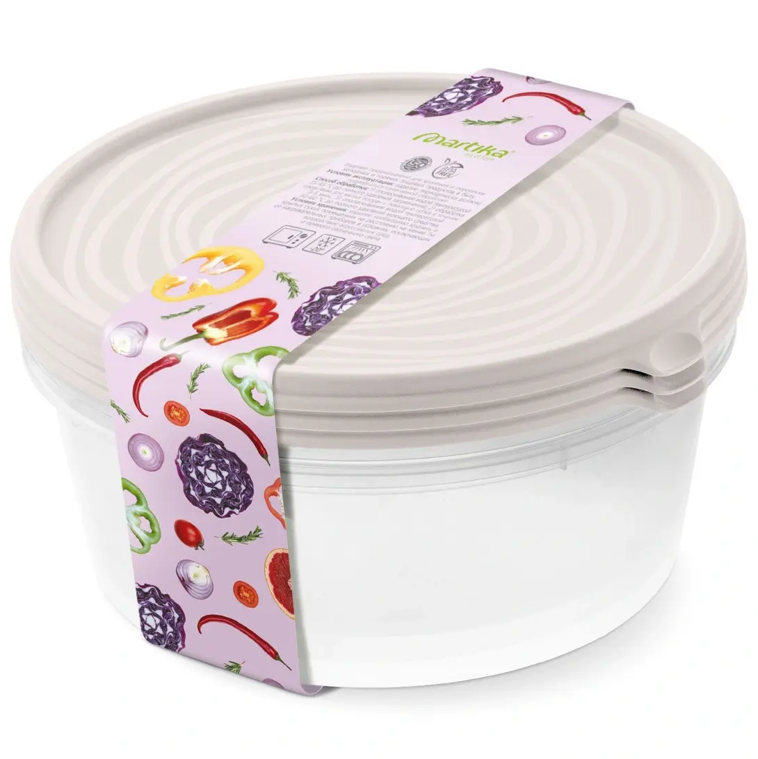 Размеры каждого контейнера: диаметр 14 см, высота 9 см. Материал: высококачественный пищевой пластик марки ПП (полипропилен).
