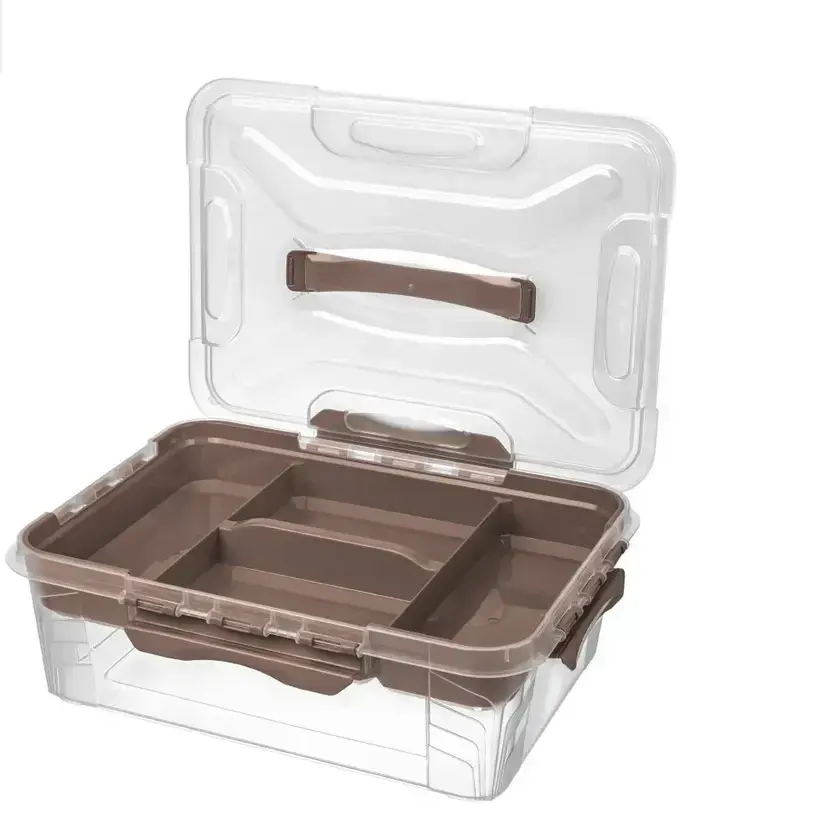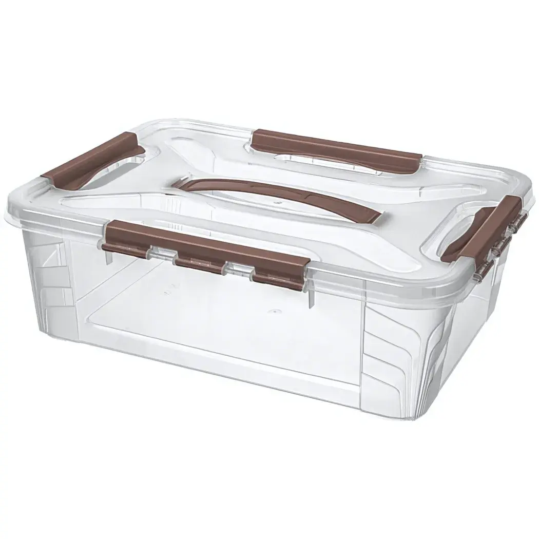 Контейнер выполнен из качественного пластика, который обеспечивает легкость и прочность. Коричневые ручки и крепления добавляют удобства в использовании. Размеры контейнера позволяют разместить его в шкафу, под кроватью или на полке, а прозрачные стенки делают его универсальным для любого интерьера.