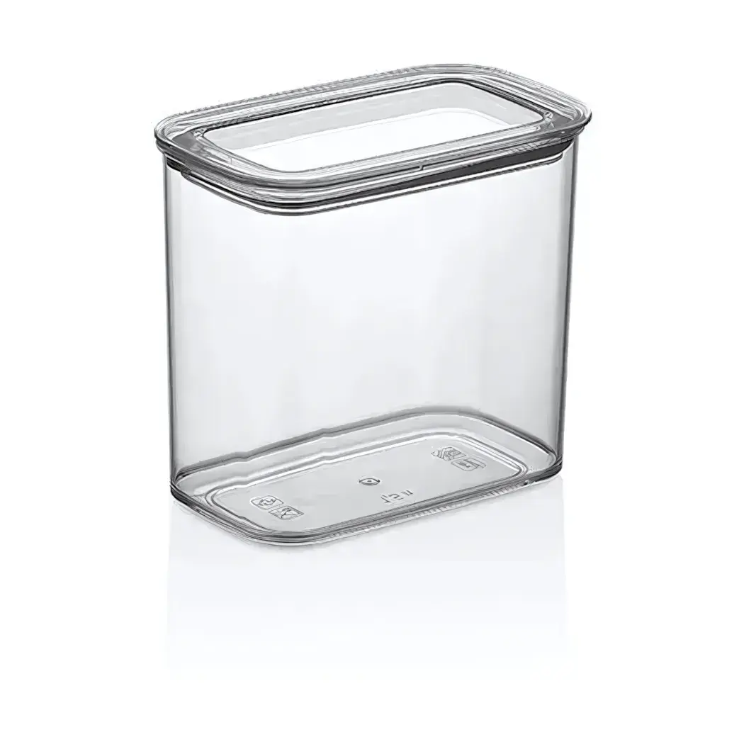Прямоугольная форма с закругленными углами упрощает очистку. Гладкая поверхность не впитывает запахи, а плотное прилегание крышки исключает просыпание содержимого. Универсальное решение для кухни и кладовой — сохраняет порядок и защищает от влаги.