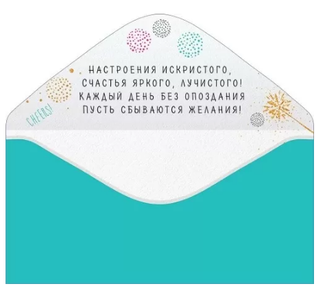 Конверт имеет белую верхнюю часть с красочным оформлением и бирюзовую нижнюю часть, что делает его стильным и современным. На конверте размещены пожелания, которые добавляют индивидуальности и тепла вашему подарку. Размеры конверта позволяют удобно разместить в нем деньги или подарочные сертификаты, а также он легко помещается в сумку или карман.