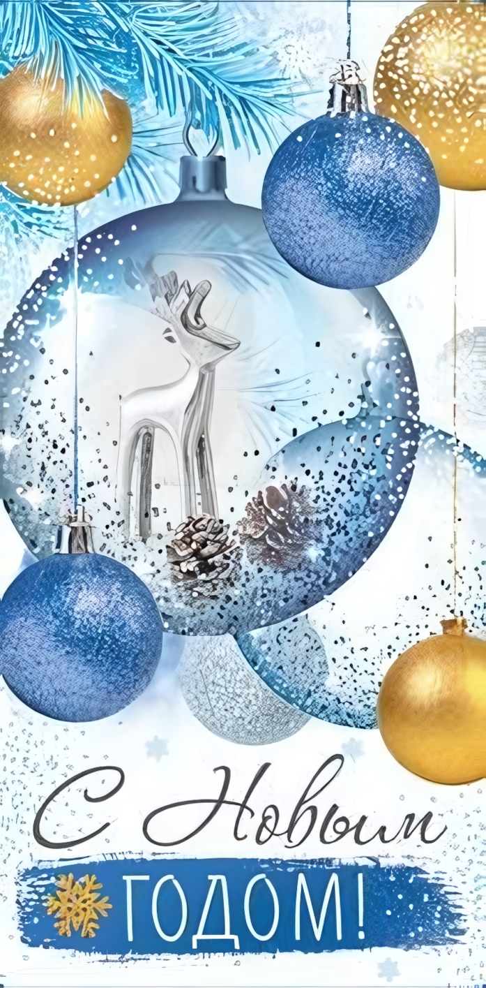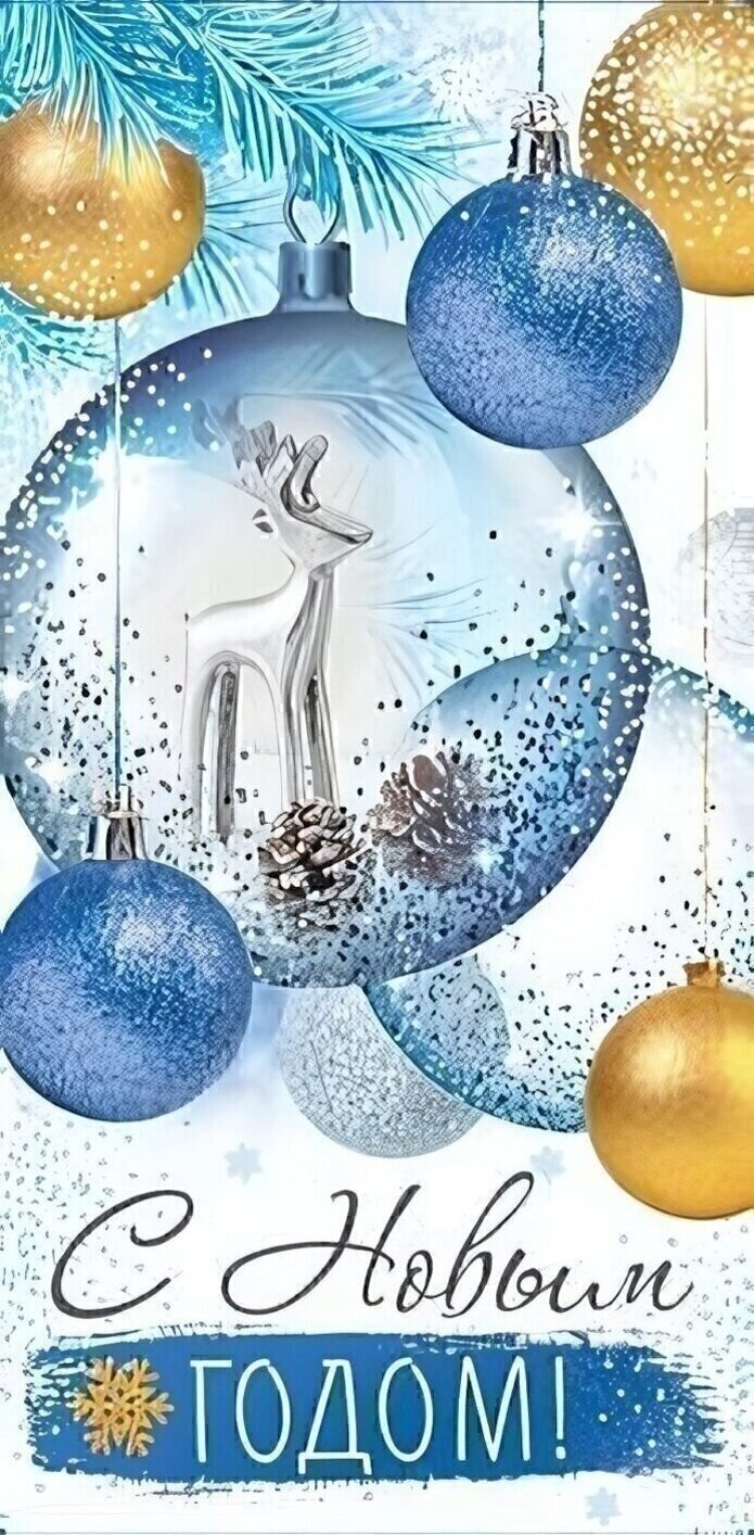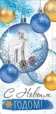 На лицевой стороне – изящное изображение ёлочного шара с серебристой фигуркой оленя, шишками и снежными элементами. Фон украшен еловыми ветвями и декоративными шарами золотого и синего цвета. Лаковая отделка с блестками придаёт дополнительный объем и сияние, создавая эффект утреннего зимнего солнца на снегу.