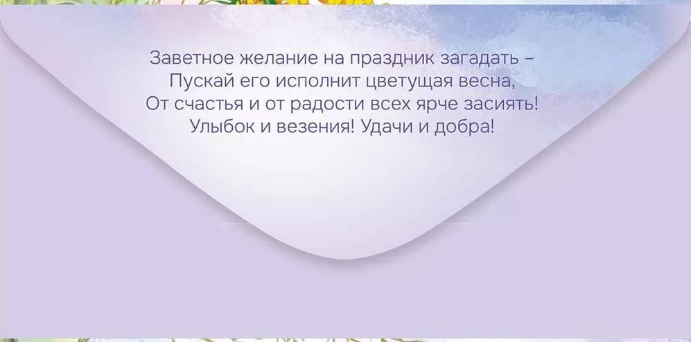 Конверт идеально подходит для подарков на Международный женский день. Его можно использовать для размещения денежных средств, подарочных сертификатов или небольших сюрпризов. Благодаря своему размеру 16х8 см, он легко помещается в сумку или карман, что делает его удобным для транспортировки.