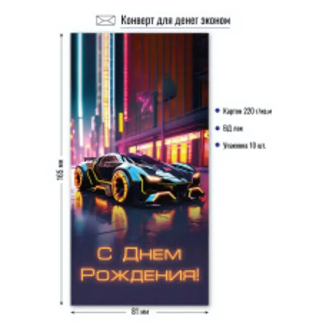 Подарите деньги оригинально и со вкусом. Конверт с динамичным дизайном спортивного автомобиля и яркими неоновыми акцентами создаст праздничное настроение.
