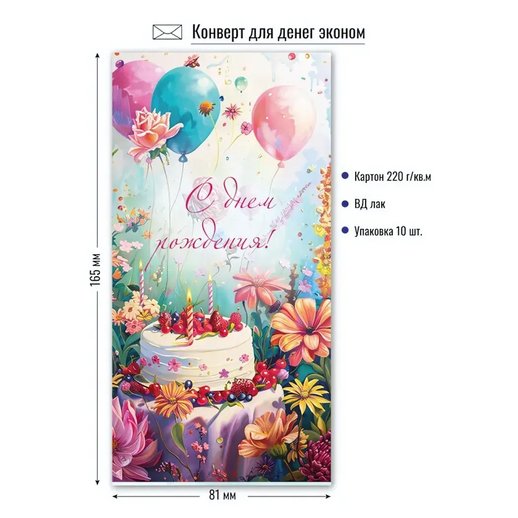 Праздничный конверт для денег создан, чтобы сделать ваш подарок особенным. Его яркий дизайн с тортом, цветами и воздушными шарами передаст радость и тепло поздравлений.