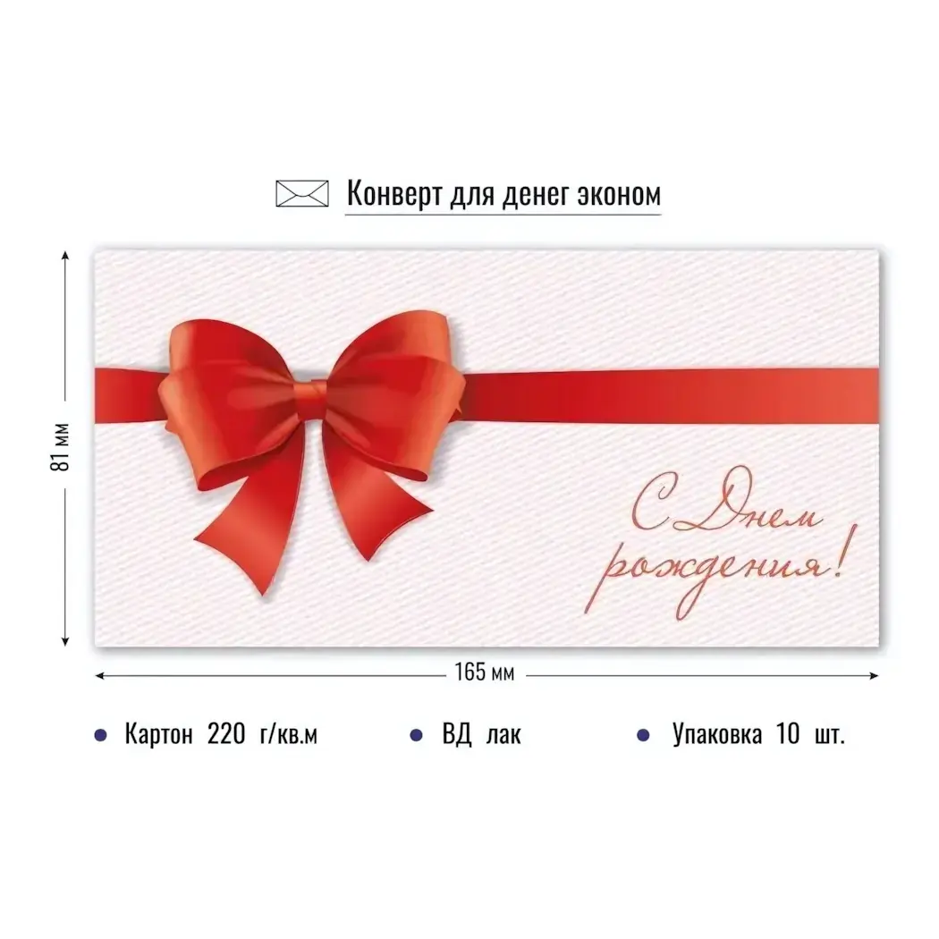 В отличие от обычных конвертов, модель 'Тайна' выполнена из плотного картона (220 г/кв.м) с защитным лаковым покрытием. Это гарантирует долговременную сохранность и презентабельный внешний вид. Размер 165х81 мм позволяет разместить как купюры, так и поздравительную записку.