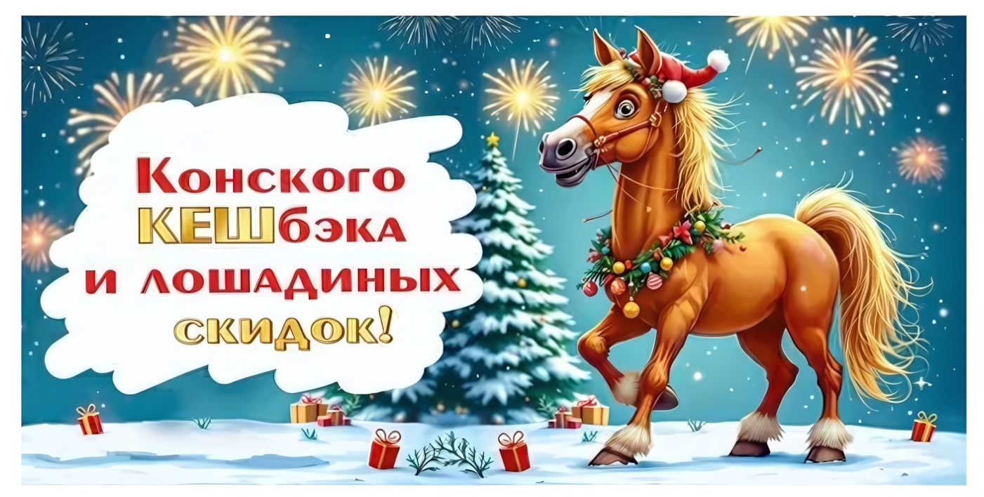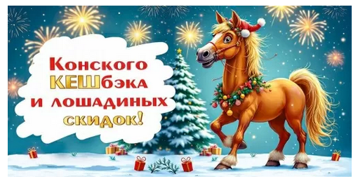 - Юмористическая надпись — фраза «Конского КЭШбэка и лошадиных скидок!» с игрой слов вызывает улыбку