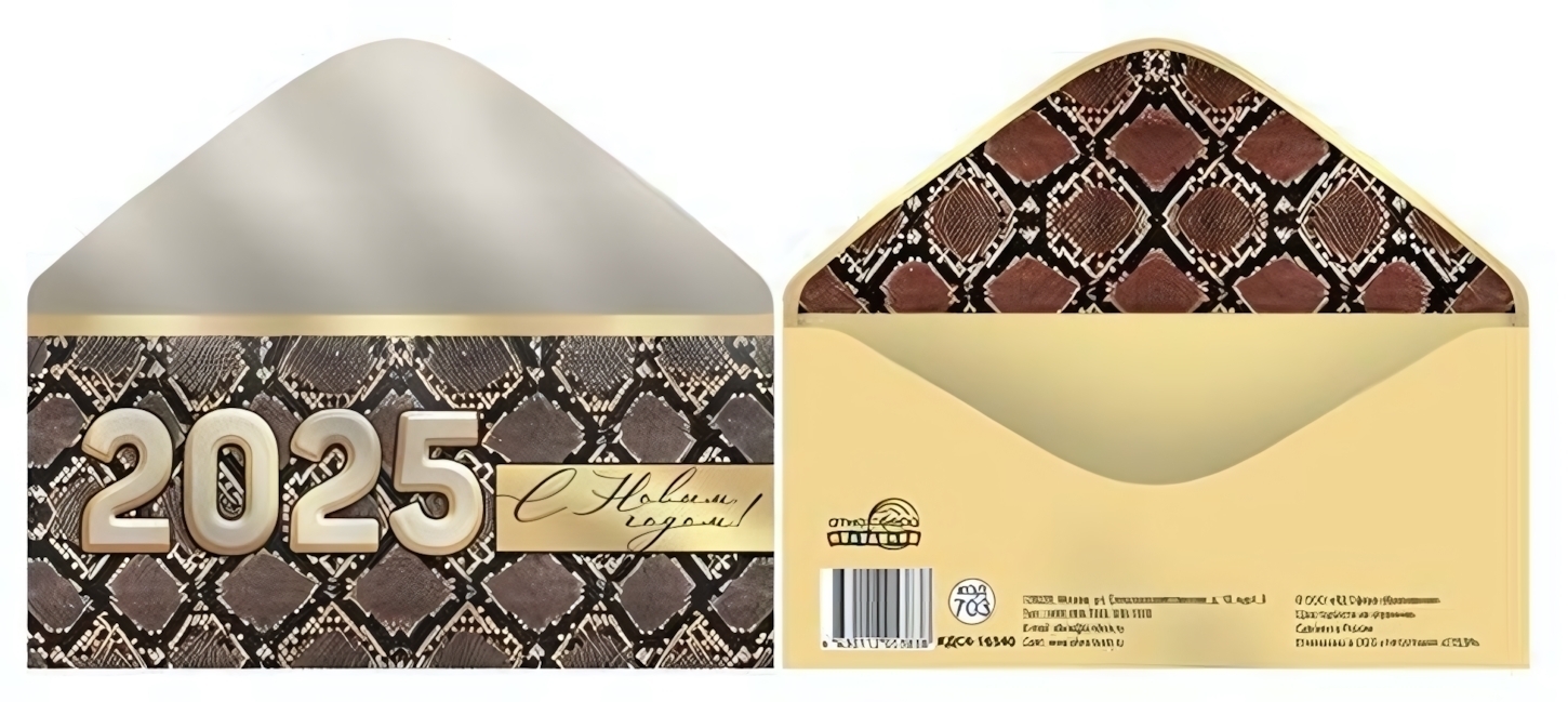 Подарок должен приносить радость с первой минуты, и этот конверт для денег точно произведет впечатление. Нарядное оформление с серебристой металлизацией в сочетании с глубоким коричневым фоном и золотистыми надписями "2025" и "С Новым годом" создаёт праздничное настроение ещё до вручения самого подарка.