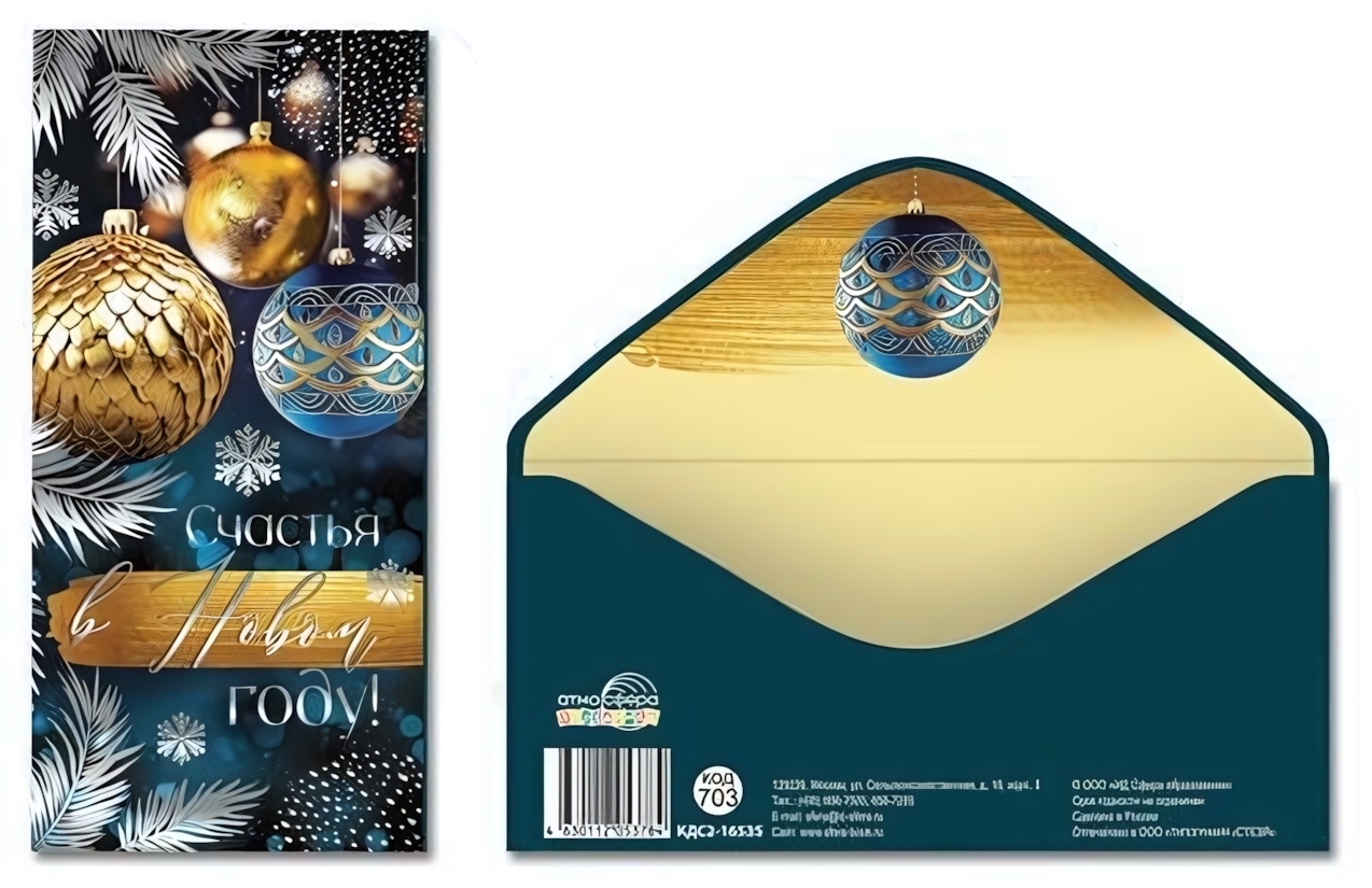 Создайте особенное настроение своему подарку с этим стильным конвертом для денег. Он украшен яркими золотыми шариками, изысканными снежинками и праздничными узорами, а надпись «Счастья в новом году!» на золотом фоне добавляет теплоты и атмосферности. Отделка из серебряной фольги ловит свет и придаёт утончённый блеск.