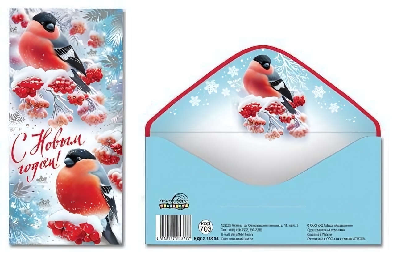 Конверт голубого цвета с красными акцентами, украшен снежными узорами и зимними мотивами. Обратная сторона выполнена в однотонном голубом цвете, что подчёркивает изысканность лицевой части. Благодаря качественным материалам изделие долго сохраняет свежесть и праздничный вид.