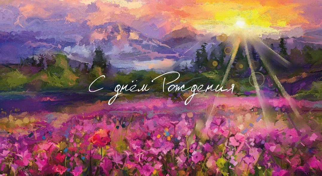 Яркие цветовые акценты в розовых и фиолетовых тонах, дополненные пейзажем с горами и цветущими полями, делают упаковку по-настоящему праздничной. Ручная надпись "С днем Рождения" добавляет особый шарм и индивидуальность.