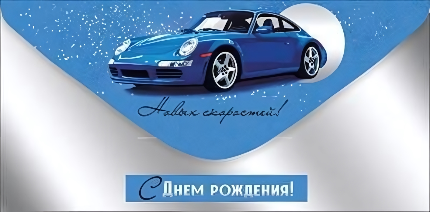 Сочетание нейтральной сине-белой палитры с лаконичными надписями делает дизайн уместным как для официальных поздравлений, так и для дружеских встреч. Автомобильная тематика добавляет индивидуальности, сохраняя при этом универсальность — такой презент понравится и автолюбителю, и деловому партнёру.