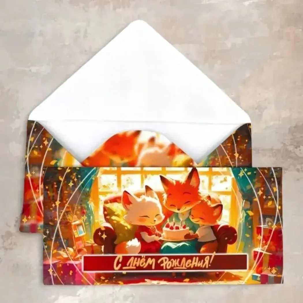 Ищете способ сделать денежный подарок по-настоящему запоминающимся? Предлагаем конверт для денег с красочным дизайном и жизнерадостной надписью «С днём рождения!». Такой конверт не только удобен для оформления подарка, но и мгновенно создаёт праздничное настроение благодаря эффектному оформлению и оригинальной иллюстрации с веселыми лесными лисёнками и праздничным тортом с горящими свечами.