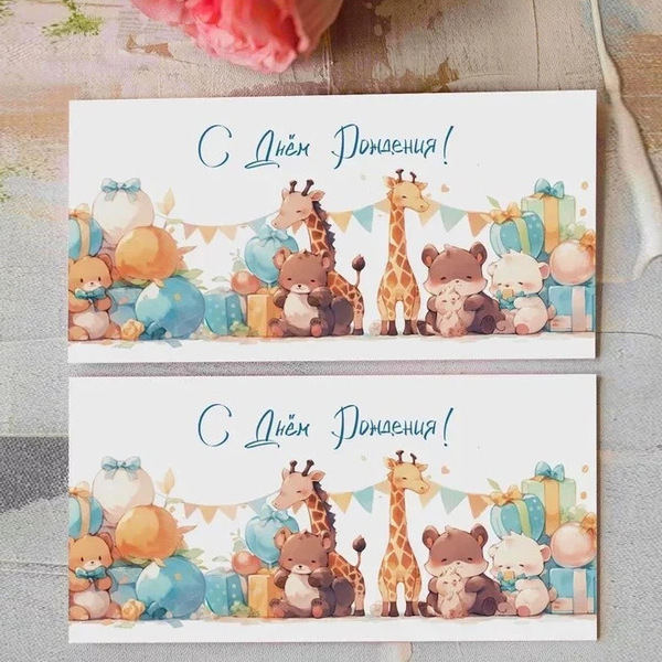 Конверт выполнен в светлых тонах и украшен милыми иллюстрациями животных, таких как жирафы и медведи, что делает его идеальным для детских праздников. Яркие цвета — бежевый, голубой, оранжевый и коричневый — создают атмосферу веселья и радости. В верхней части конверта написано 'С Днём Рождения!', что добавляет ему праздничного настроения.