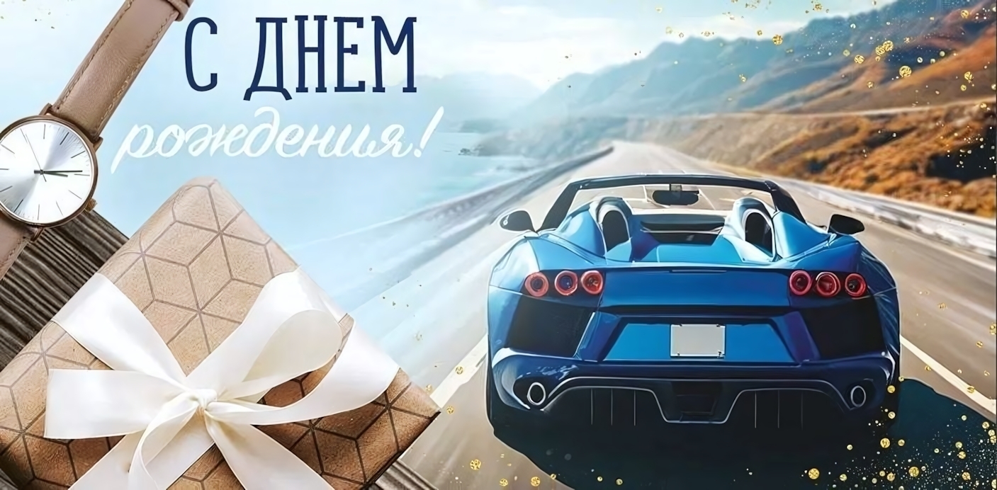- Универсальный дизайн с элементами мужской тематики: спортивный автомобиль, часы в подарочной коробке и геометрические узоры