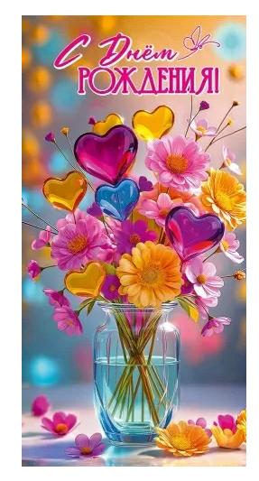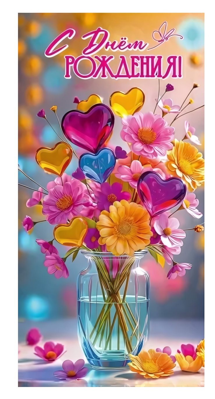 На лицевой стороне изображена прозрачная ваза с ярким букетом и глянцевыми сердцами на фоне мягких световых бликов. Надпись «С днём рождения!» выполнена крупным декоративным шрифтом и сразу привлекает внимание. Такой конверт особенно понравится романтичным натурам и тем, кто ценит красивые детали.