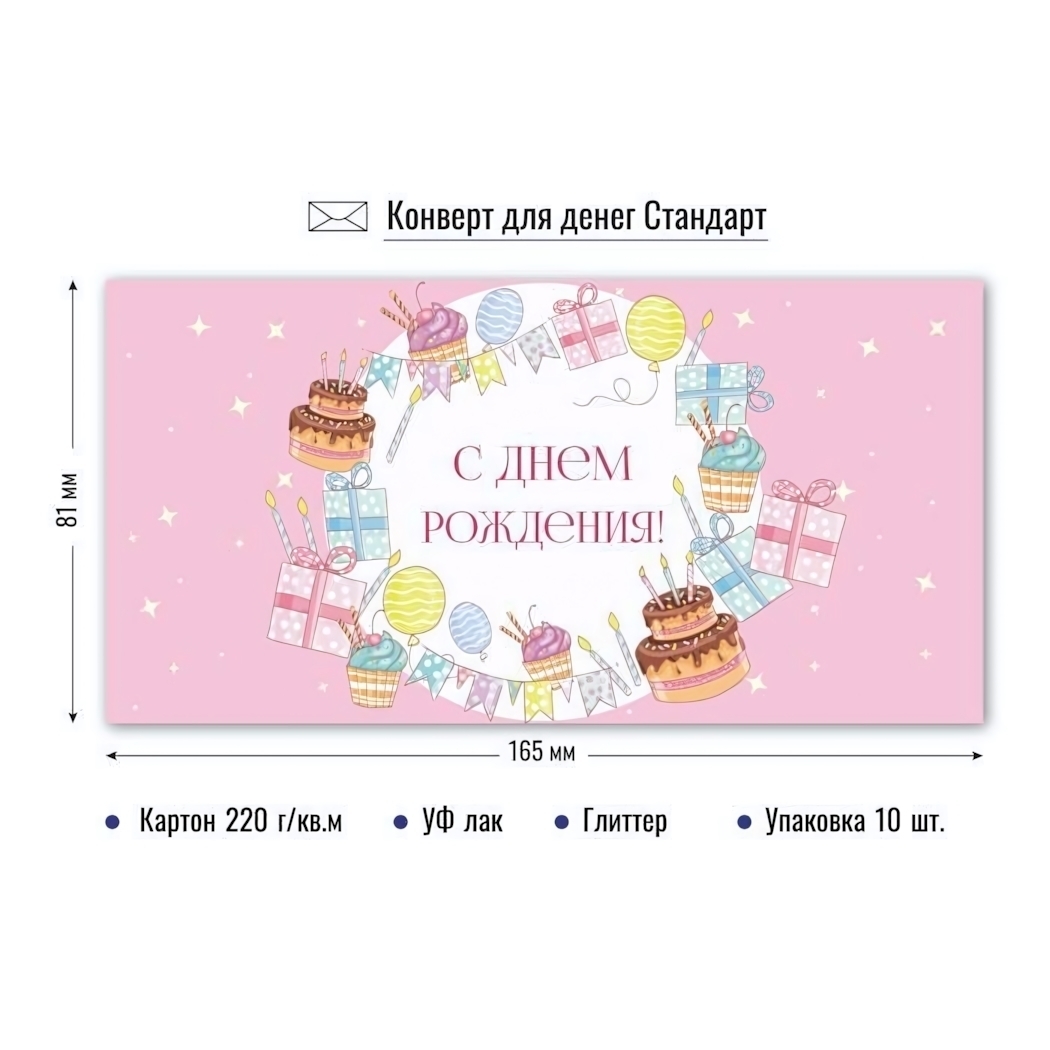 Конверт подходит для вручения денежных средств или подарочных сертификатов на день рождения. Это идеальное решение для поздравления друзей, родственников или коллег, если хочется сделать подарок эстетичным и запоминающимся. Стандартный формат 165×81 мм легко помещается в сумку или открытку.