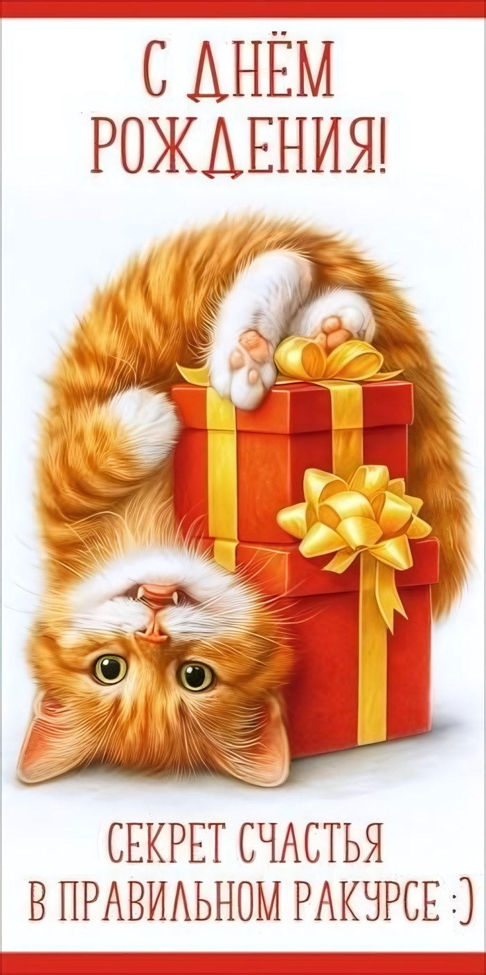 Лицевая сторона украшена милым рисунком с рыжим котом и подарочной коробкой, а также запоминающейся надписью «С Днём рождения! Секрет счастья в правильном ракурсе». Дизайн вызывает теплые эмоции и создает праздничное настроение. Внутри конверта нет лишнего текста, оставляя простор для ваших личных слов поздравления.