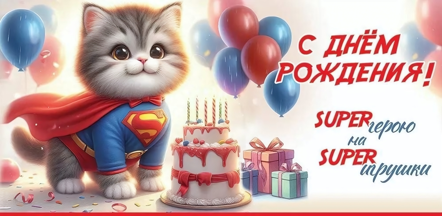 - Эмоциональный посыл: Надпись "С Днём Рождения! SUPER герою на SUPER игрушки" создаёт праздничное настроение.