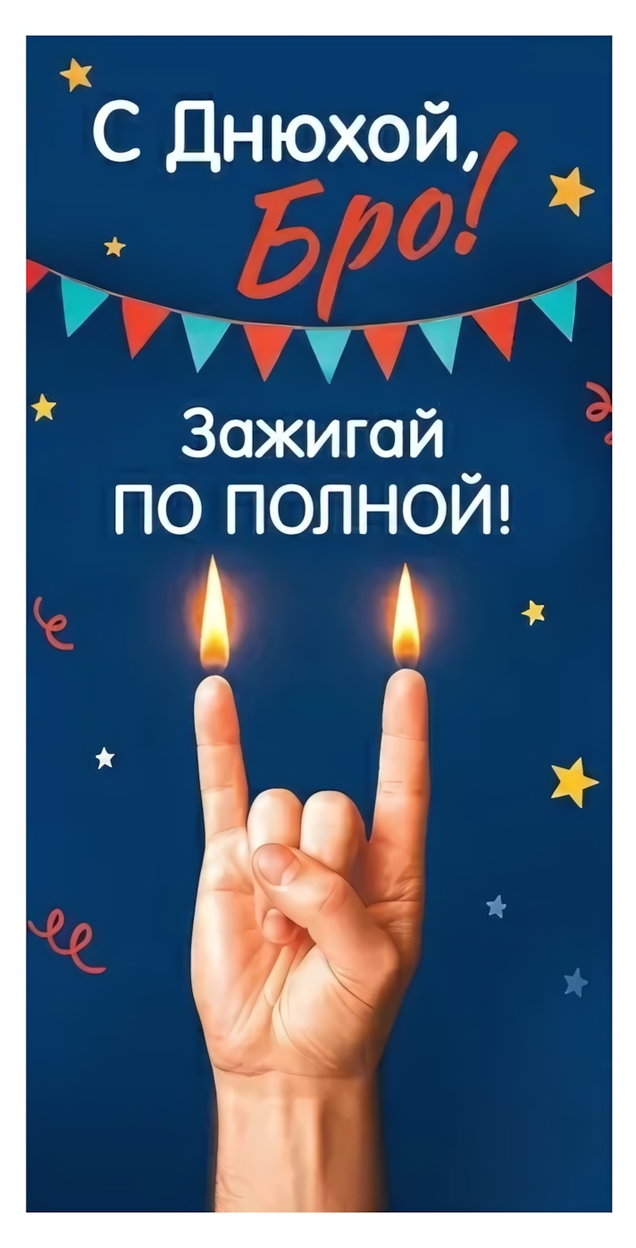 - Яркий и современный дизайн: Стильная надпись «С Днюхой, Бро! Зажигай по полной!» на тёмно-синем фоне с гирляндой флажков и весёлыми звёздами создаёт праздничную атмосферу.