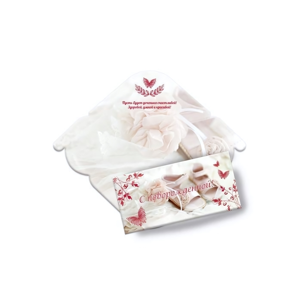 Подарите не просто деньги, а настоящее поздравление с нежным дизайном. Конверт украшен цветами и бабочками, что делает его особенным подарком для молодых родителей.
