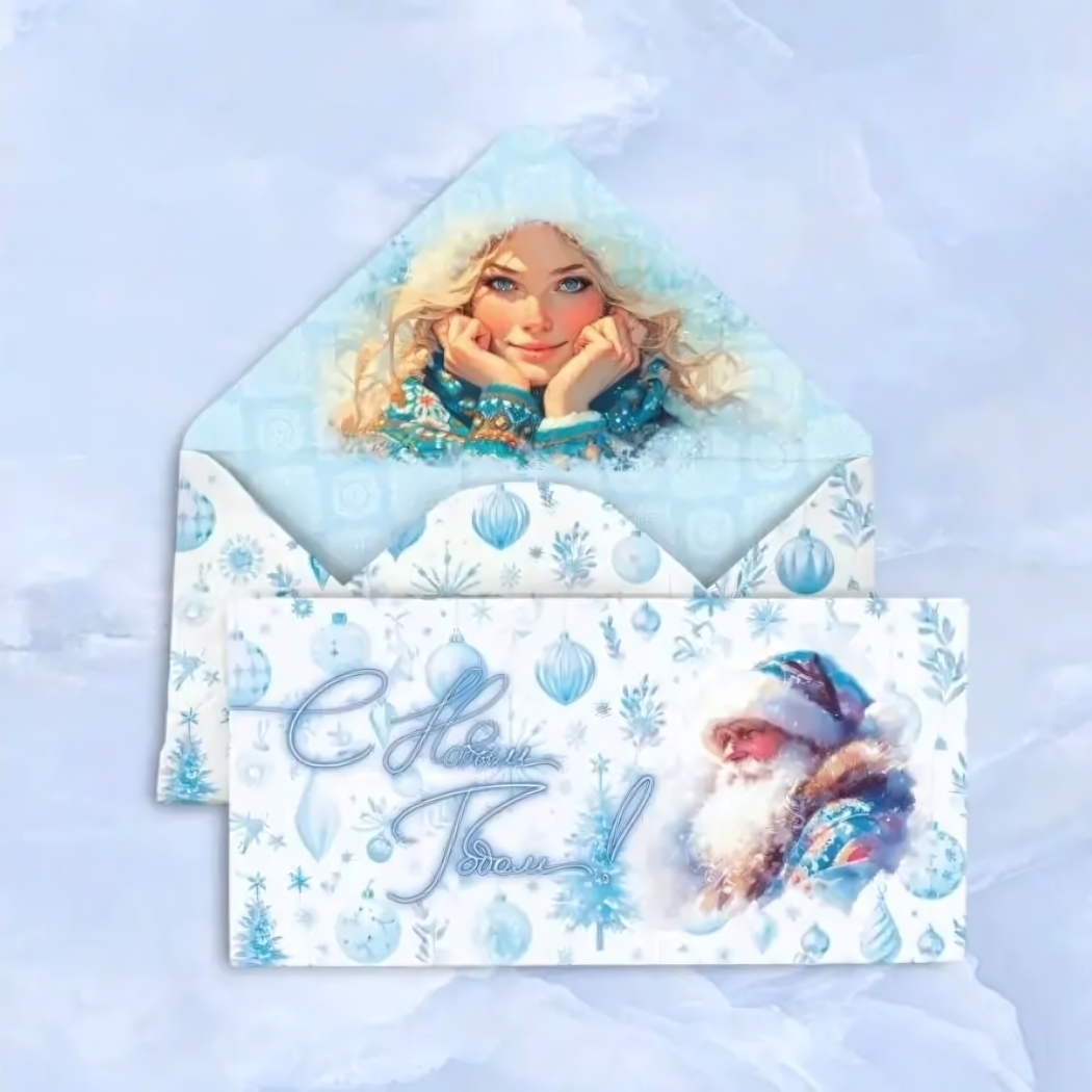 Этот конверт для денег станет идеальным способом вручения денежного подарка на Новый год. Его стильный дизайн с изображением Деда Мороза и зимними мотивами создаст настоящую праздничную атмосферу.