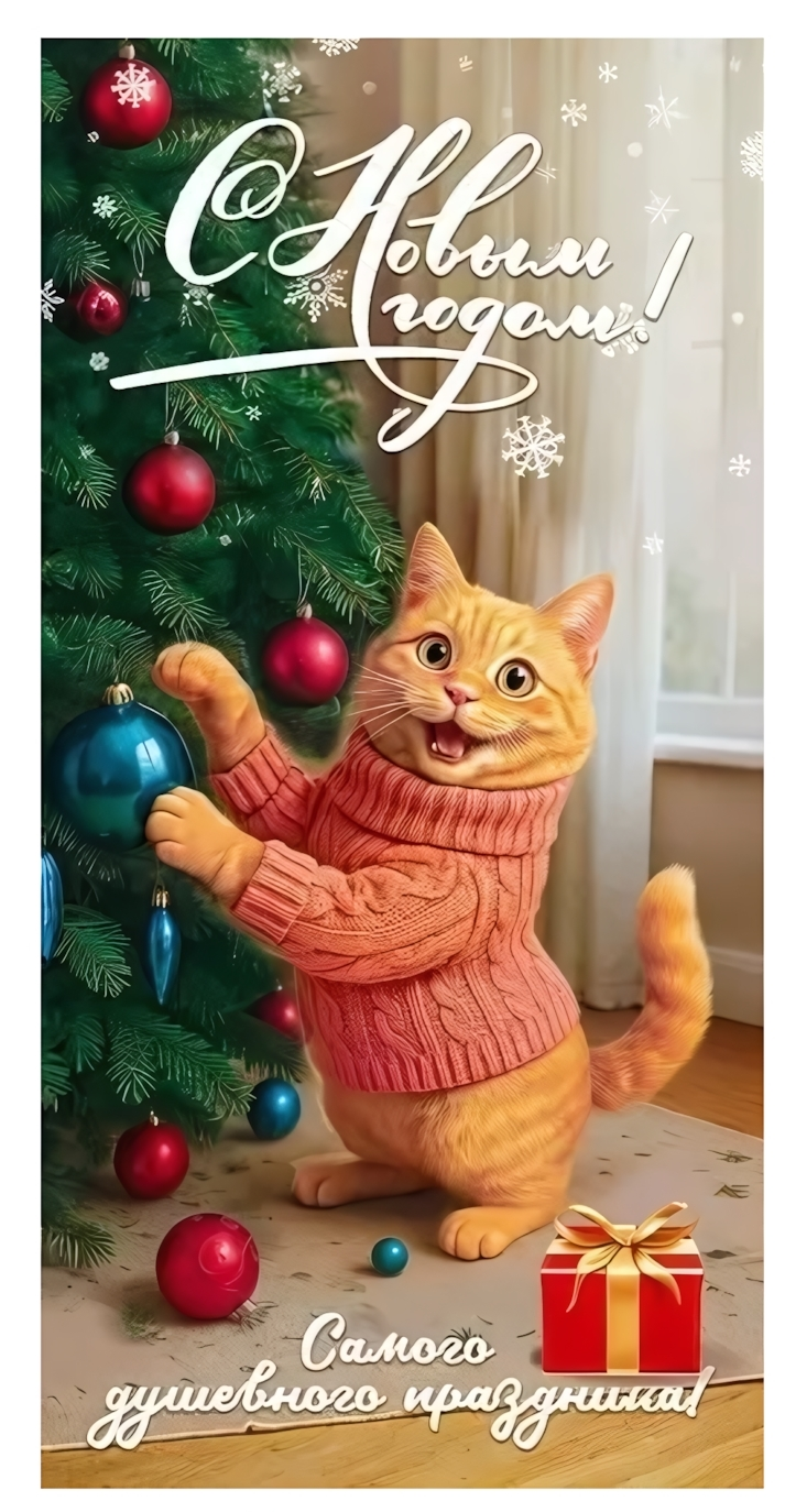Подарите тепло и улыбку вместе с этим праздничным конвертом для денег. Его яркий дизайн с рыжим котом в уютном свитере и елочными украшениями создаст атмосферу душевного праздника и станет прекрасным дополнением к вашему подарку. Покрытие с глянцевым УФ-лаком придает изображению насыщенность и защищает изделие от повреждений.
