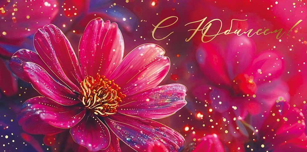 Конверт выполнен в формате евро, что позволяет удобно разместить денежные купюры. Яркий цветочный дизайн с использованием блесток придает конверту праздничный и торжественный вид. Надпись "С Юбилеем!", выполненная золотым шрифтом, добавляет элегантности и подчеркивает значимость события.