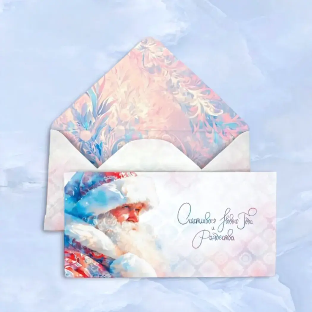 Выбирая конверт «Счастливого Нового Года и Рождества», вы получаете не просто упаковку для денег, а стильный аксессуар, который добавит изюминку вашему подарку. Нежные пастельные цвета и акварельное изображение Деда Мороза создают атмосферу волшебства и радости. Внутренняя сторона конверта украшена ярким узором с флористическими элементами, что делает его еще более привлекательным.