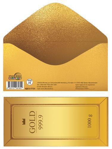 Размер конверта: 17х9 см. Изготовлен из плотного картона с глянцевым покрытием. Декоративные элементы "GOLD" и "999.9" создают эффект настоящего золотого слитка.