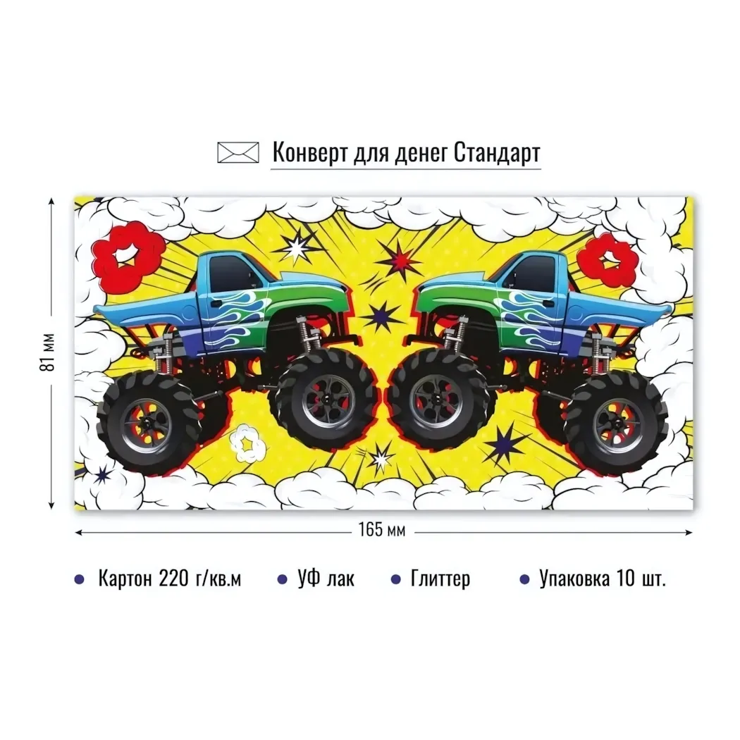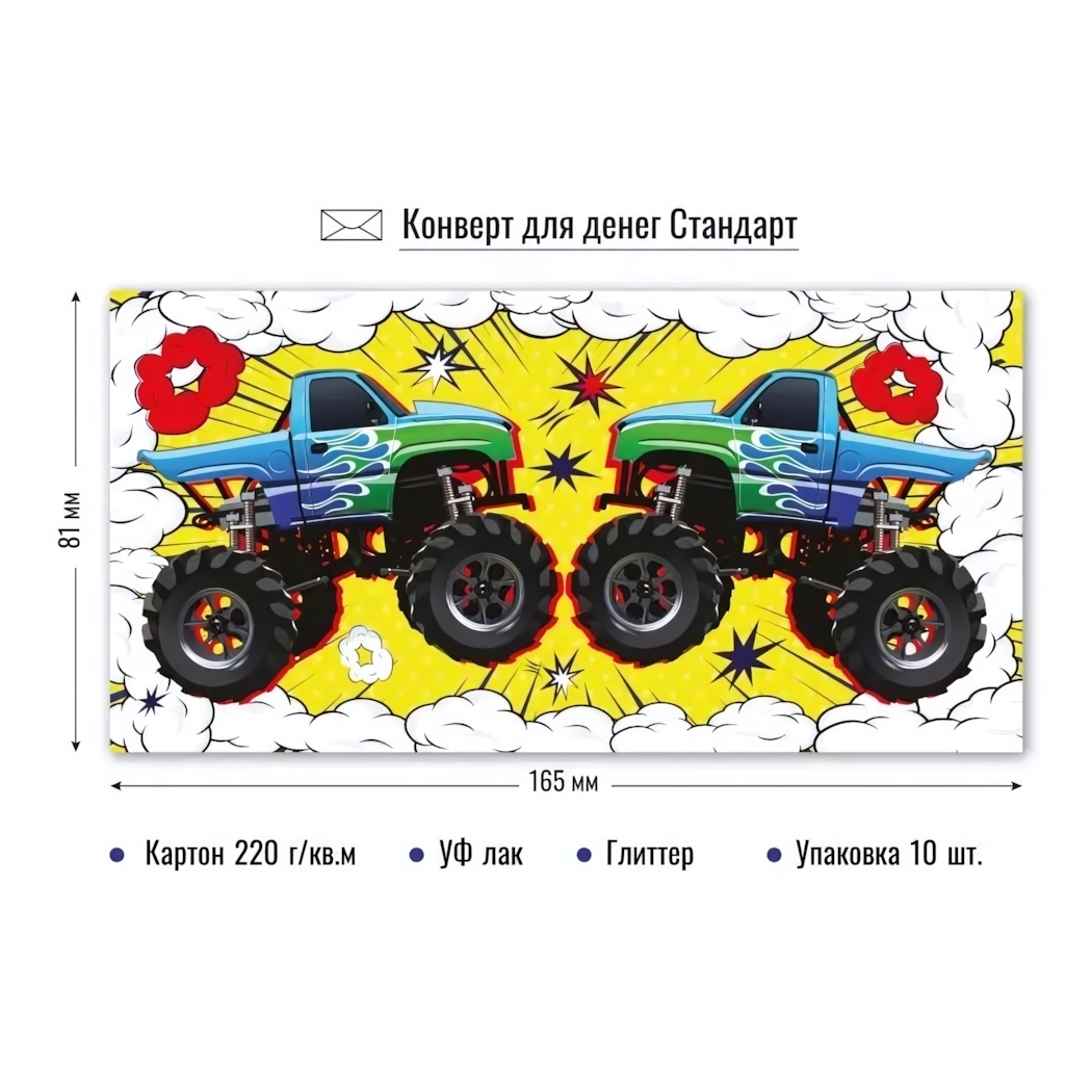 Конверт для денег «Монстр-трак», картон 220 г/м², 16,5х8,1 см, УФ-лак и глиттер