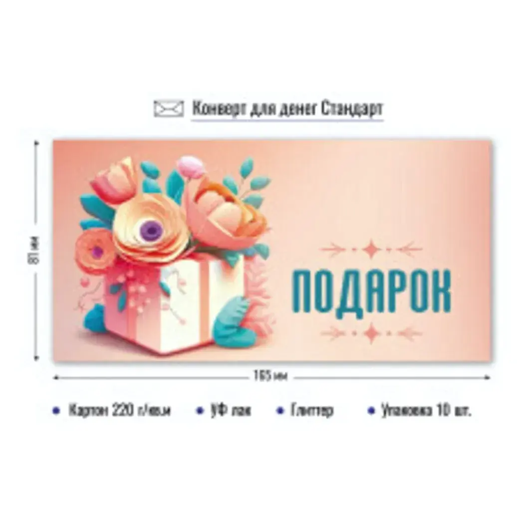 Выбирая конверт для денег Стандарт, вы получаете не только красивую упаковку, но и практичное решение для подарков. УФ-лак и блестящие элементы добавляют изысканности и делают конверт еще более привлекательным.